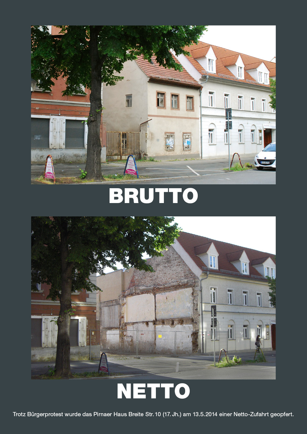 Das Kuratorium Altstadt Pirna e.V. hat am 15.4.2014 in der Stadtratssitzung im Rahmen des Tagesordnungspunktes „Anfragen der Einwohner“ Kritik an der Darstellung der Stadtverwaltung geübt, die Installierung des Netto-Marktes sei nicht zu verhindern gewesen. Mit dieser Darstellung wurden die Mitglieder des Stadtentwicklungsausschusses zum „gemeindlichen Einvernehmen“ gedrängt. Richtig ist, daß die Installierung des Schwarzen-Netto-Marktes durch die Genehmigung des Abrisses des Hauses Breite Straße 10 ermöglicht wurde, diese Genehmigung erfolgte am Stadtrat und an der Öffentlichkeit vorbei. Dei Stadt wollte den neuen Supermarkt und hat ihren Wunsch nach Abbruch des Denkmals an das Landesamt für Denkmalpflege herangetragen. Ein demokratischer Meinungsbildungsprozeß wurde schon im Ansatz verhindert.